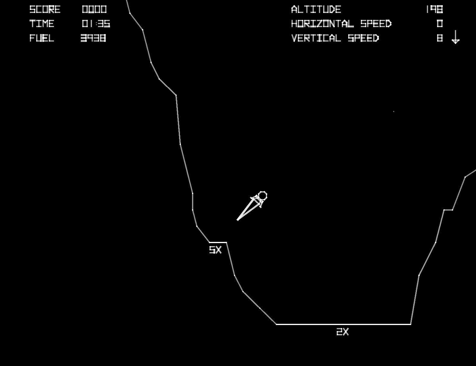 Together with a coworker, Rich Moore, Delman recreated Moonlander's gameplay with the necessary adjustments to meet its primary objective: to encourage players to insert as many quarters as possible into the coin-operated machine. In contrast to the original game, the Delman and Moore-created Lunar Lander arcade game allowed players to purchase propellant for 25 cents. Each coin added 1,800 fuel to the available supply. The objective was standard: to land gently and on a surface that permitted it, i.e. was flat. The presence of a miniature platform indicating the difficulty multiplier (x2, x3, x4, x5) distinguished these positions. With each landing, the player was awarded points proportional to the speed of impact with the ground, multiplied by a difficulty factor based on the topographical features of the environment.